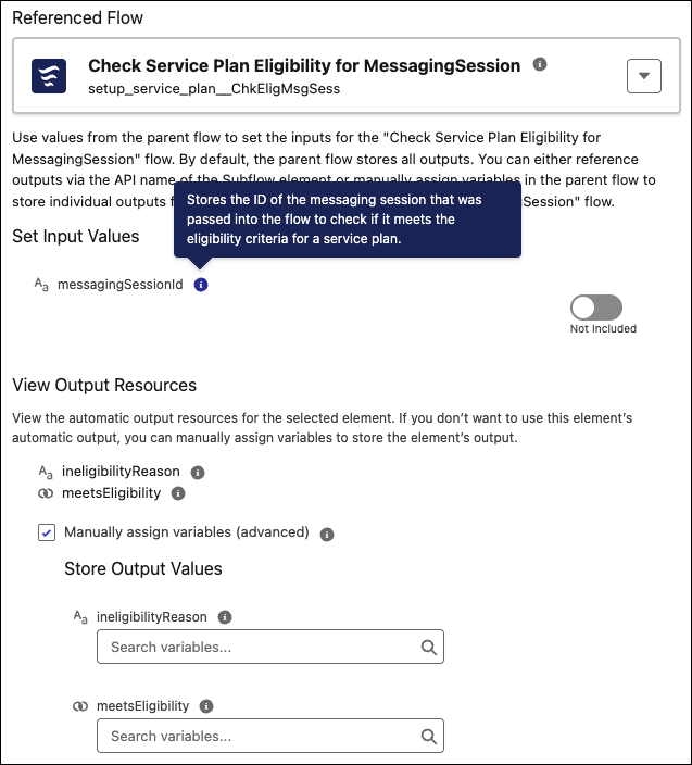 The infobubbles for subflow output variables now show the custom description set by the admin or developer. If no custom description is defined, improved default text guides you to assign a resource. Additionally, view descriptions for a subflow’s input resources in an infobubble even if the resource isn’t included. Previously, you had to enable the input resource to know whether you needed it.