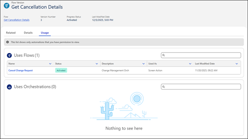 Understand flow dependencies with the new Usage subtab in the Automation Lightning app. The subtab shows bidirectional relationships, including which automations a flow version uses and which automation versions depend on that flow. This visibility helps you assess the impact of changes before modifying or deactivating flows.