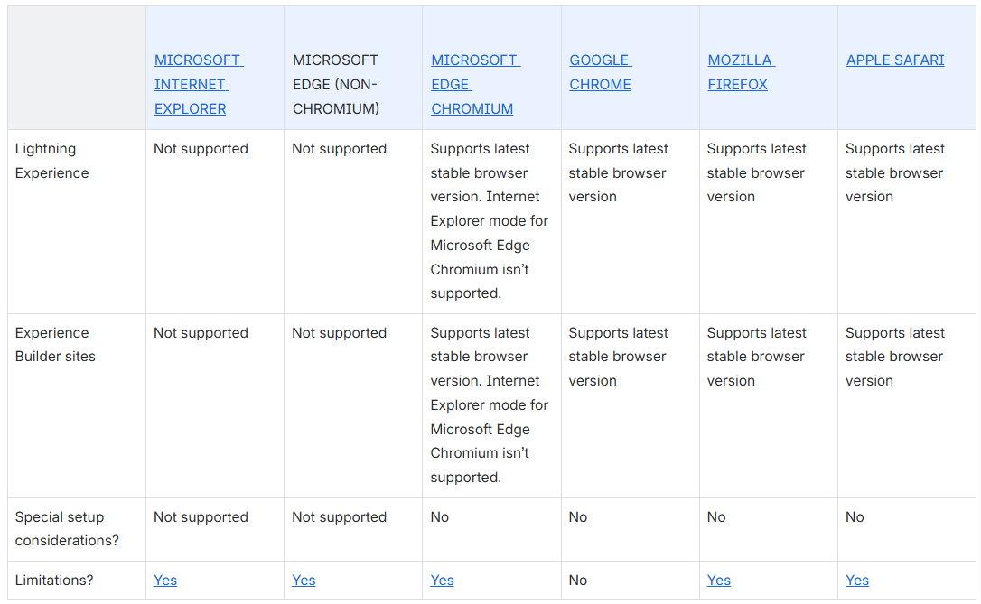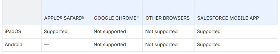Salesforce supports these browsers. Make sure that your browsers are up to date. Other browsers or older versions of supported browsers aren’t guaranteed to support all features.