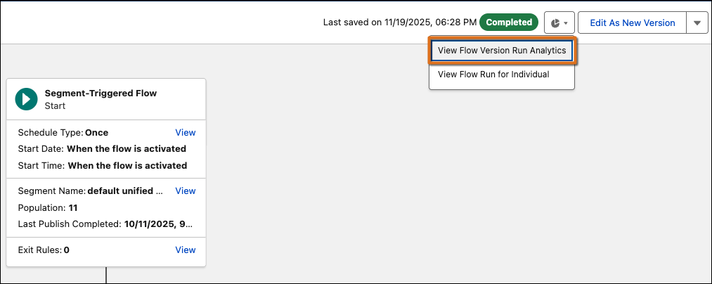 How: View version analytics in Flow Builder by opening a flow with completed runs, clicking , and selecting View Flow Version Run Analytics from the dropdown menu. Review the summary panel for overview metrics, or click Open Details to access the comprehensive Tableau dashboard.