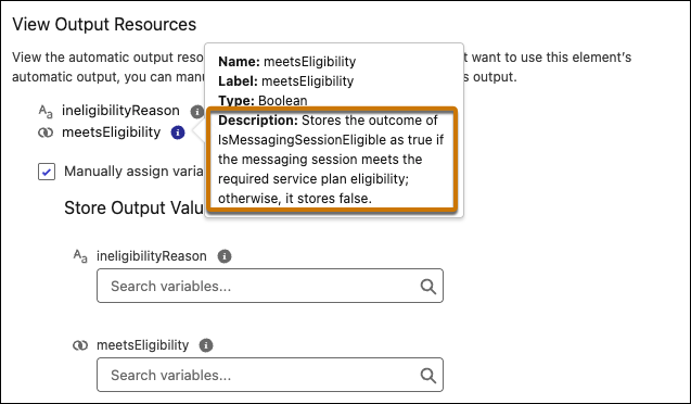 For subflow outputs, hover over the infobubble in the View Output Resources list to see the variable’s name, label, type, and description