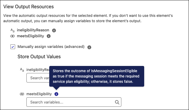 When you select Manually assign variables (advanced), the infobubble next to each output value shows the custom description, replacing the previous generic message.