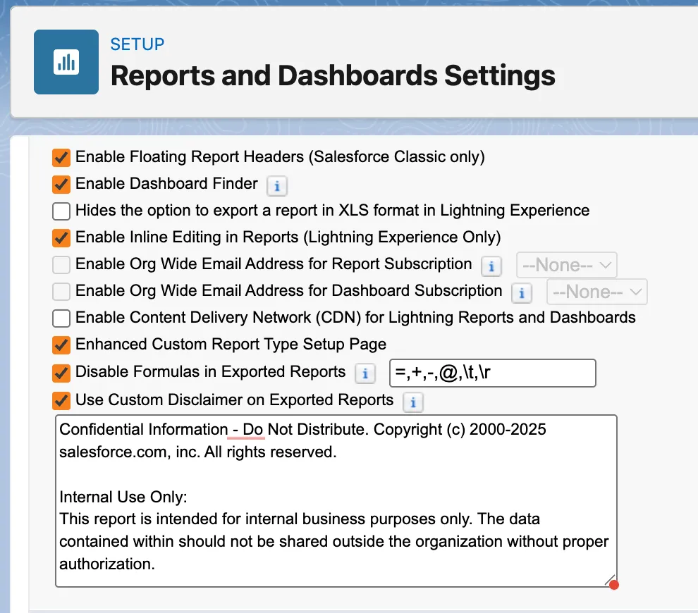 How: In Setup, in the Quick Find box, enter Reports and select Reports and Dashboards Settings. Select Use Custom Disclaimer on Exported Reports. In the text box, enter the custom disclaimer to show after the default Salesforce disclaimer.