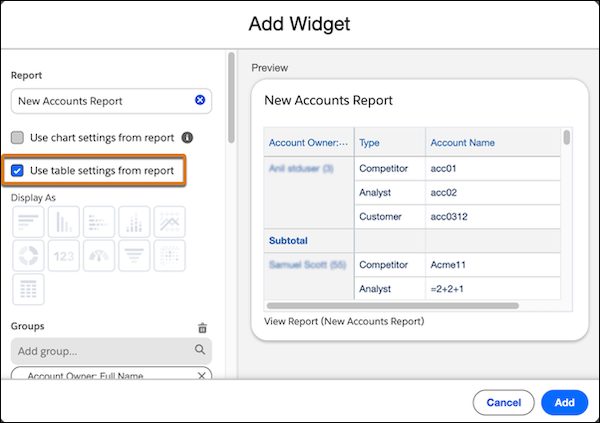 Save time and reduce manual configuration of report settings, such as groupings, custom formulas, and bucketing when adding lightning tables to dashboards. This feature reduces the risk of errors and ensures that the tables in the dashboard retain the same configuration as the report. This feature is now generally available.