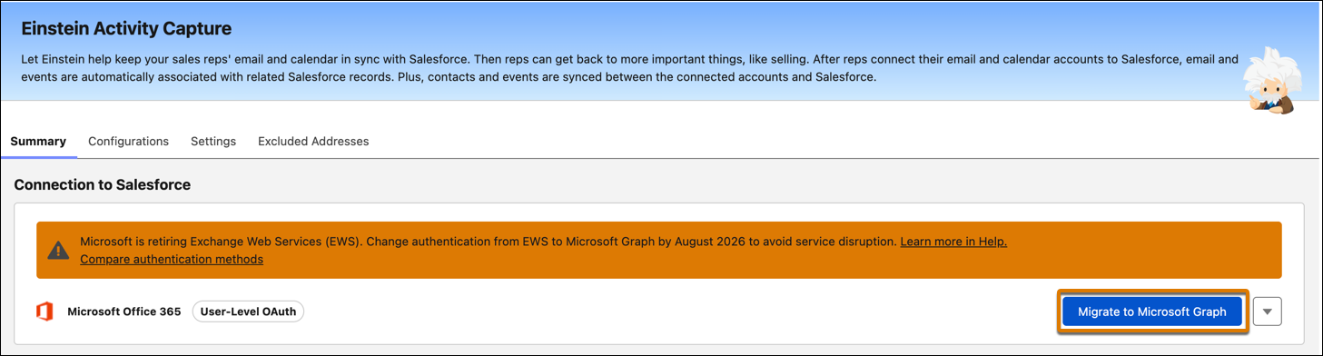 Transition your Einstein Activity Capture’s Microsoft 365 authentication from Exchange Web Services (EWS) to Microsoft Graph, which is more modern, secure, and scalable. Microsoft is retiring EWS in October 2026, so switch to Microsoft Graph to avoid service disruption. Proactive notifications and a single-click tool make the migration process smooth.